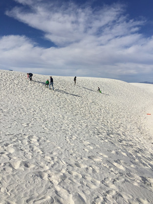 A wind-swept landscape of snow white gypsum crystals piled up in dunes edged by dark mountains in the distance. A family playground in a waterless beach setting.
